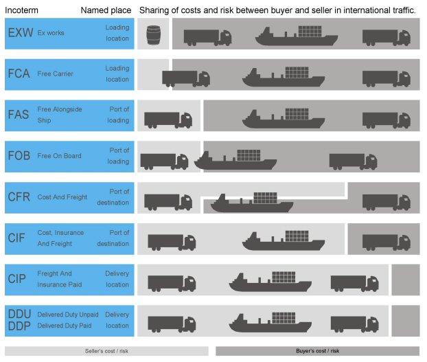 EXW – Ex Works (მიწოდების ადგილის დასახელება) ეს ტერმინი აკისრებს მაქსიმალურ პასუხისმგებლობას მყიდველს და მინიმალურს გამყიდველს. Ex Worksეს ტერმინი ხშირად გამოიყენება საქონლის საწყისი ღირებულების დადგენისას- კოტირებისას, რომელიც არ შეიცავს დამატებით ხარჯებს. EXW ნიშნავს, რომ გამყიდველი მზადაა შეაგროვოს საქონელი თავის ტერიტორიაზე რაღაც შეთანხმებული ვადით. მყიდველი ანაზღაურებს ყველა სატრანსპორტო ხარჯს და ასევე იღებს თავის თავზე რისკს საქონლის საბოლოო პუნქტამდე ტრანსპორტირებისათვის. გამყიდველი არ ტვირთავს საქონელს და არც უშვებს ექსპორტზე. თუ გამყიდველი ტვირთავს, ეს აისახება ღირებულებაში და რისკი ედება მყიდველს. თუ მხარეებს სურთ, რომ გამყიდველი იღებდეს საქონლის დატვირთვის პასუხისმგებლობას, ასევე იღებდეს ასეთი დატვირთვის ყველა რისკს და დანახარჯებს, ეს ნათლად და მკაფიოდ უნდა იყოს განსაზღვრული ყიდვა-გაყიდვის ხელშეკრულებაში.